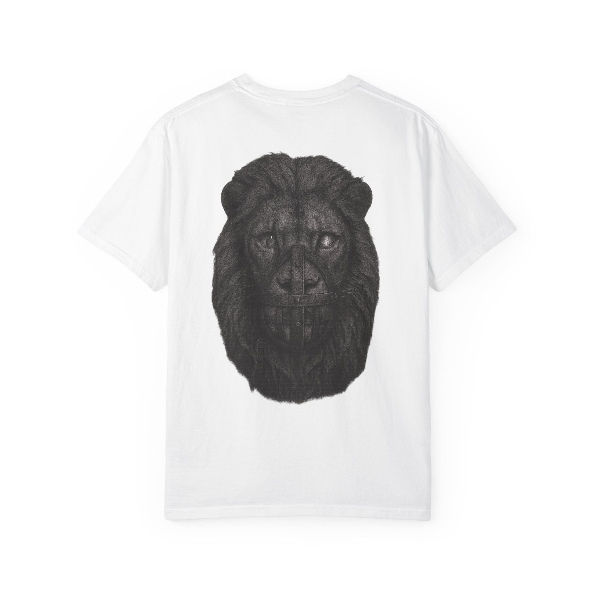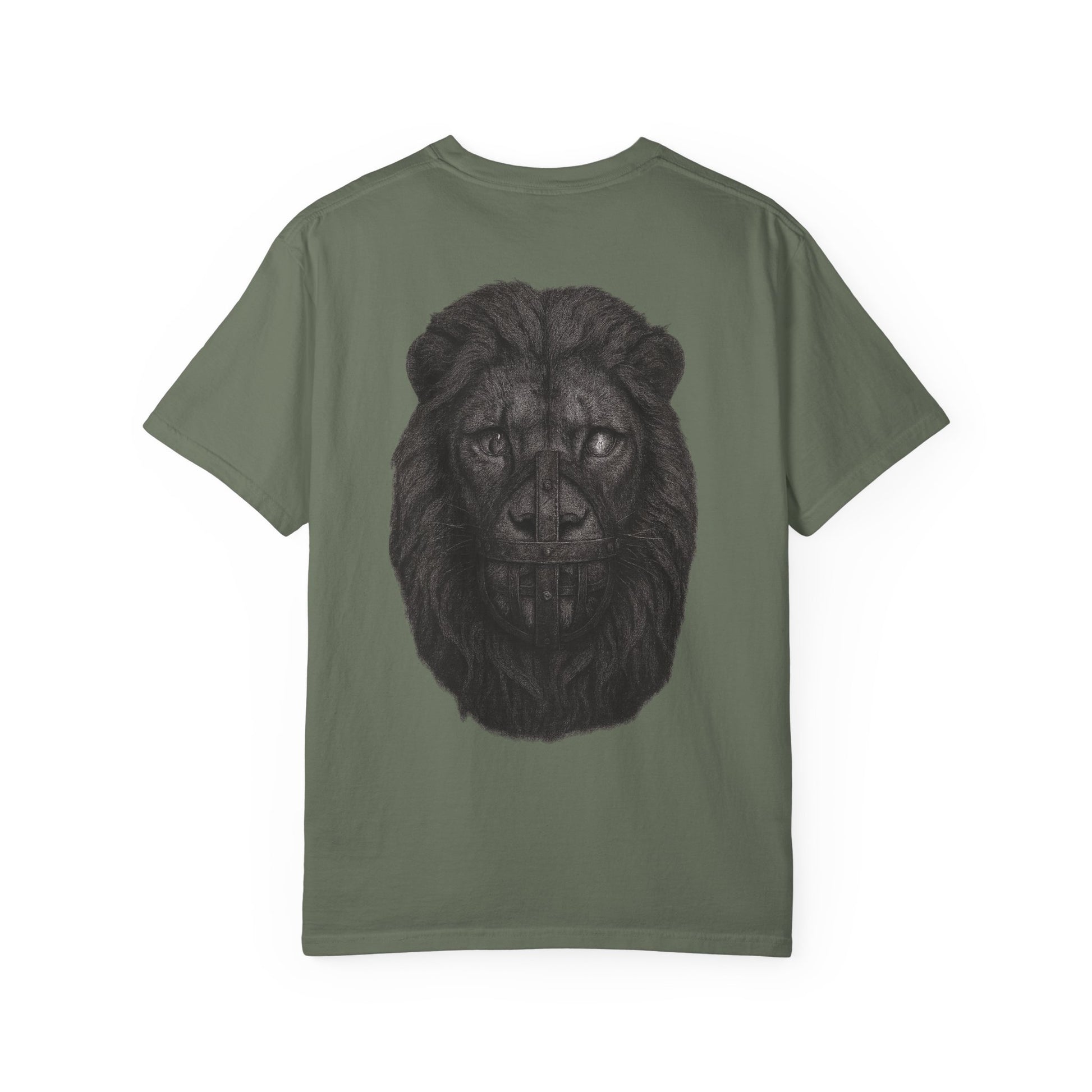The lion on the back stands fierce, yet bound by a muzzle. In its eyes, the reflection of Daniel and the presence of God — a scene from the den, where fear should reign but faith stands unshaken.